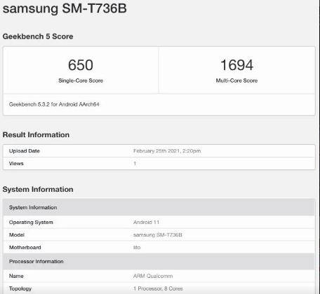 Galaxy Tab S7 Lite的SM-T736B變體已經(jīng)在Geekbench 5上發(fā)現(xiàn)了代號(hào)為“ lito”的處理器。高通芯片提供的基本頻率為1.80GHz。SoC結(jié)合了4 GB的RAM,該設(shè)備可在Android 11 OS上運(yùn)行。在單核測(cè)試中,該設(shè)備獲得650分,在多核測(cè)試中達(dá)到1694分。