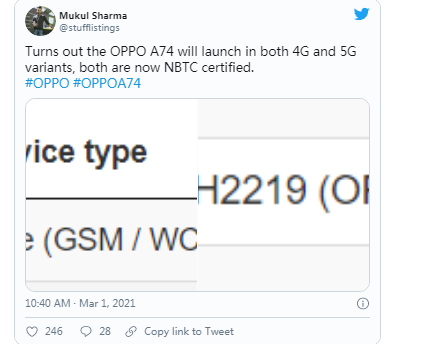 該手機還被發現在其他認證站點,例如Wi-Fi聯盟,BIS(印度),TKDN(印度尼西亞),EEC(歐洲)和NBTC(泰國)。CPH2219已被NBTC當局批準為OPPO A74 4G。同一實體將另一款型號為CPH2197的電話認證為OPPO A74 5G。