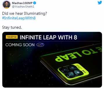 另外,Realme印度公司負責人Madhav Sheth在發布前嘲笑了照明色選項。該圖以黑色顯示手機的后面板,同時以發光的綠色顯示攝像頭模塊和“敢于跨越”徽標。我們還可以看到相機外殼上刻有“ 108MP四相機”,這表明我們可能正在使用Realme 8 Pro。這可能是將加入常規顏色選項的特殊限量版型號。