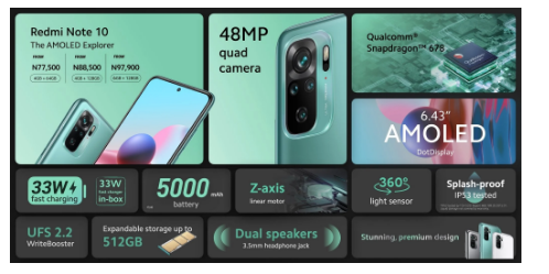 該手機還具有側面安裝的指紋掃描儀,立體聲揚聲器,IP53等級,紅外端口,音頻插孔和USB-C端口。它具有5000mAh的電池容量,并支持33W快速充電。以下是尼日利亞的Redmi Note 10'價格: