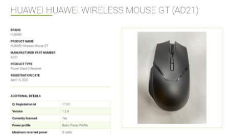 我們?cè)跓o(wú)線電源聯(lián)盟的數(shù)據(jù)庫(kù)中遇到了華為鼠標(biāo)。根據(jù)清單,輸入設(shè)備稱為Huawei Wireless Mouse GT,型號(hào)為AD21。