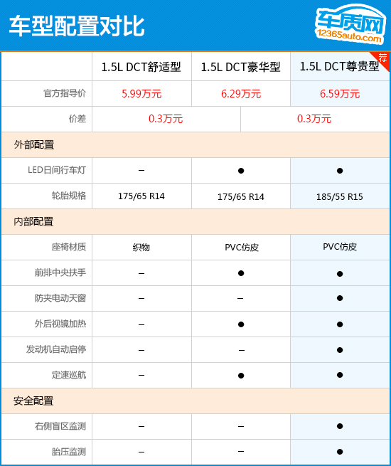 走“低價高配”路線的全新一代悅翔贏得了不少贊許,通過配置表,小編最終向大家推舉頂配1.5L DCT尊貴型,因為它配置最全面。小編之所以沒有推舉1.4L車型,主要是考慮到國人駕駛習慣,如今手動擋的操作方式并不能讓多數消費者接受。1.5L車型匹配的濕式雙離合變速箱,減少頻繁手動換擋的疲勞。推舉車型在價格上僅比低一個配置的豪華型貴出3000元,小編認為完全沒必要吝嗇這筆費用。因為,這3000元差價可以得到更大尺寸的輪圈,防夾電動天窗、胎壓監測、右側盲區監測、發動機自動啟停這些有用配置,整體來看性價比最高,值得推舉。