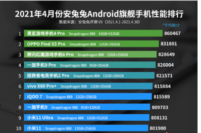 該列表完全由非常有趣的Snapdragon 888旗艦機型主導。排名中,Black Shark 4 Pro以860467的平均得分保持了其榜首的位置,比上個月繼續強勁增長。但是,3月份上榜的六款車型在4月份的排名中名列前茅。型號包括ASUS ROG Phone 5,Vivo X60 Pro +,iQOO 7, Redmi K40 Pro, 魅族18 和魅族18 Pro。