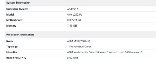 Geekbench列表顯示,Vivo V2123A由具有MT6877型號的聯發科芯片組提供動力。根據型號可以說該手機由Dimensity 900芯片供電。