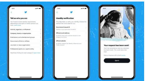 在2017年暫停驗(yàn)證后,Twitter已重新啟動其程序,以便社交網(wǎng)絡(luò)的任何用戶都可以請求驗(yàn)證其個人資料,從而獲得所需的藍(lán)色徽章。