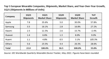 蘋果是可穿戴設(shè)備的領(lǐng)先公司之一,這也適用于歐洲市場(chǎng)。根據(jù)IDC透露的數(shù)據(jù),今年第一季度蘋果繼續(xù)領(lǐng)跑歐洲可穿戴市場(chǎng),銷量超過(guò)780萬(wàn)臺(tái)。