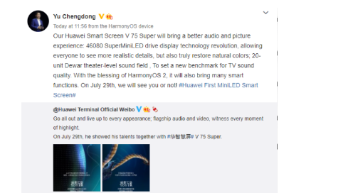 這家中國科技巨頭在其官方微博賬戶上分享了這一消息,透露了發(fā)布日期。華為消費者BG CEO余承東表示,新款Smart Screen V 75 Super將配備46,080顆SuperMini LED。這將使其能夠提供具有準確細節(jié)的更逼真的圖像以及微調的能力。對于聲音,即將推出的電視將提供 20 個單位的杜瓦劇院級聲場。