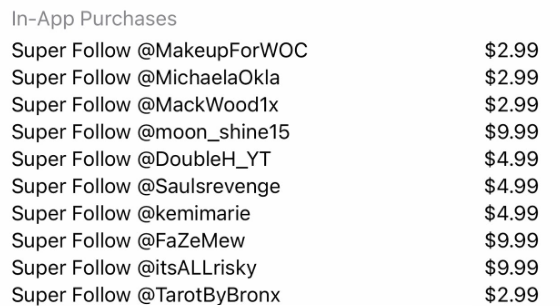 Wong 引用了 Twitter 的 App Store 產(chǎn)品頁(yè)面,該頁(yè)面顯示了十大最受歡迎的應(yīng)用內(nèi)購(gòu)買(mǎi)項(xiàng)目。由于 Super Followers 像離散 IAP 一樣處理,并且 App Store 根據(jù)受歡迎程度對(duì) SKU 進(jìn)行優(yōu)先排序,因此當(dāng)前列表由已激活該功能的個(gè)人帳戶(hù)填充。