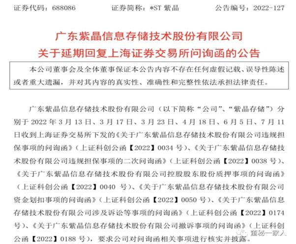 導讀 9月24日藍光存儲的第1股紫晶存儲再度發出相應的公告,對于2021年度公司財務報告所發出的詢問函,再次決定延遲回復,這次的延遲已經是紫晶存儲第18次延遲回復了。除了對于上面詢問函的相關回復之外,對于其他的6個詢問函也發布了相應的延遲回復的公告。