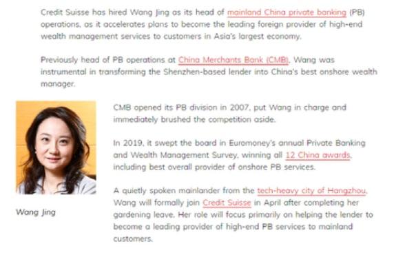 在1994年的時候,王菁與招商證券開始屬于自身的銀行工作,2007年。對于銀行私人業務進行籌建,在招商銀行工作超過了25年,在財富管理方面有著眾多經驗,2020年加入瑞信證券,對于中國境內的財富管理進行負責。當時王菁表明想要加入瑞信主要是幫助瑞士信貸公司,對國內高凈值客戶市場進行占領。