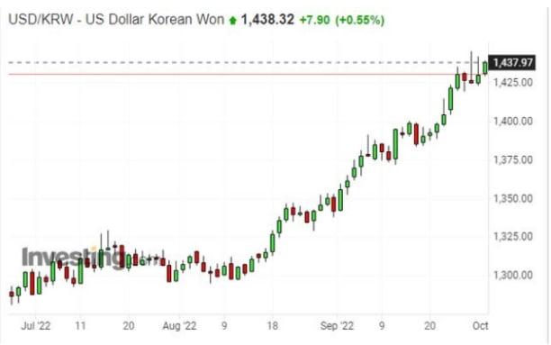 韓國出口同比增長15億美元,這也是歷年的同月最高記錄,俄烏戰爭不僅僅影響到歐洲的能源問題,對韓國也有嚴重的影響。持續的貿易逆差有可能引發美元對韓元的匯率崩塌,這對韓國人民來說是巨大的打擊。美聯儲的持續加息政策,不僅僅給日本和英國帶來嚴重影響,韓元的匯率也在持續下跌,截止到發文前,美元對韓元匯率跌破1445元,這是2009年以來的最低記錄。