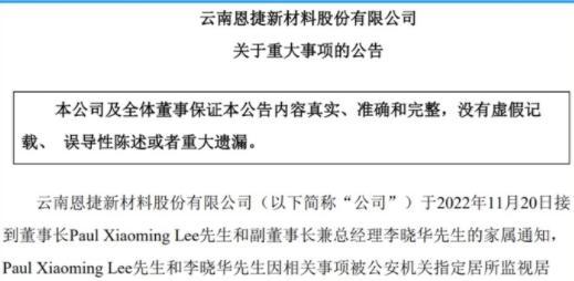 在11月21日晚上恩捷股份在社交媒體發(fā)布了一則公告,在公告中稱恩捷股份在11月20日的時候接到了董事長李小明和副董事長李曉華的家屬通知,家屬說兩個人現(xiàn)在因為一些相關(guān)的事項,被公安機關(guān)指定居住場所進(jìn)行監(jiān)視,對于此事的相關(guān)事宜,還在進(jìn)一步的調(diào)查中。