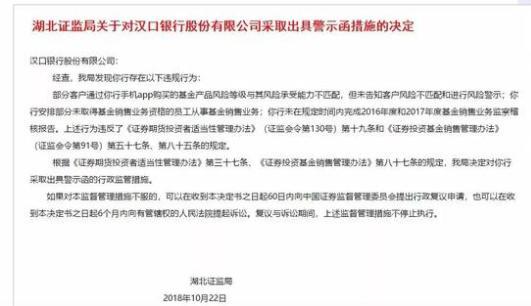 在11月25日的時候,河北證監局就對河北銀行出去了,官員要求其進行風險管理制度和整改的警示函,福建海峽銀行福州片區分行交通銀行福建分行也存在有部分未取得基金從業資格人員,在自己的朋友圈中發宣傳推介基金銷售業務被責令整改,
