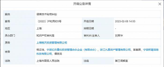 今年2月8日一份案號為(2022)滬知民初5號的侵害技術(shù)秘密糾紛案開庭。上海銳天投資管理有限公司為本案的原告,被告是有楊云浩,苗春暉,譚渤龍,寧波幻方量化投資管理合伙企業(yè),寧波機(jī)密信息科技有限公司,浙江九章資產(chǎn)管理有限公司等。