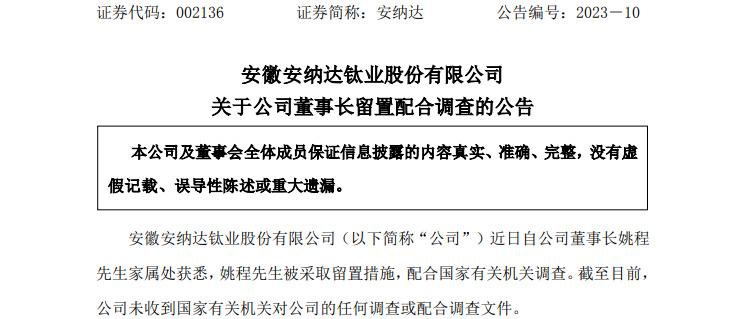 近日又一A股公司董事長被留置,安納達(dá)在2月27日發(fā)布的晚間公告公司董事長姚程目前被采取留置措施,雖然現(xiàn)在公司沒有收到國家有關(guān)機(jī)關(guān)對(duì)公司任何的調(diào)查或者是配合調(diào)查的文件,但是公司已經(jīng)決定在新一屆董事會(huì)換屆之后,姚程不將擔(dān)任公司董事長職務(wù),據(jù)資料顯示1985年出生的姚程是在銅化集團(tuán)任職10多年,現(xiàn)在是集團(tuán)董事和副董事長,是從2020年9月成為安納達(dá)的董事長,直到2023年3月20日任職期滿。除姚程被留置以外,還有85后,差一個(gè)月任職期滿,控股股東兩任“掌門人”被查,根據(jù)安徽紀(jì)檢委發(fā)布的消息在2018年11月通化集團(tuán)原黨委書馬蘇安涉及嚴(yán)重違紀(jì)違法,接受審查與調(diào)查,調(diào)查結(jié)果馬蘇安在擔(dān)任銅陵縣縣委書記、銅陵市工業(yè)投資集團(tuán)公司董事長、銅化集團(tuán)有限公司黨委書記期間,利用個(gè)人職權(quán)幫助他人謀取利益,非法獲得財(cái)物共折合人民幣高達(dá)359萬余元,已經(jīng)判處有期徒刑11年6個(gè)月,處罰金額人民幣200萬元。銅化集團(tuán)原黨委書記、董事長陳嘉生在2022年9月因?yàn)閲?yán)重設(shè)計(jì)違紀(jì)違法,現(xiàn)接受紀(jì)律審查和監(jiān)察調(diào)查。