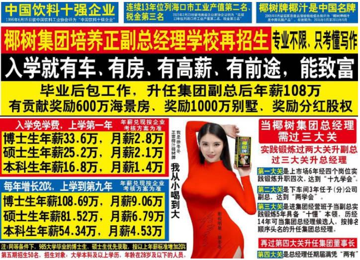 從這一份招聘內容可以看到,椰樹集團正在招總經理學員,上面的要求比較明顯,對本科生、碩士生、博士生都規劃了不同的年薪,這些學員畢業之后還包分配,最高能夠升任集團副總,年薪可以高達108萬,并且能夠擁有600萬的海景房和年終獎,但這份招工廣告最吸引眼球的并不是他們的年薪和待遇,而是廣告上熟悉的畫風,讓一眾網友表示他們的美工仍舊是非常的靠譜。
