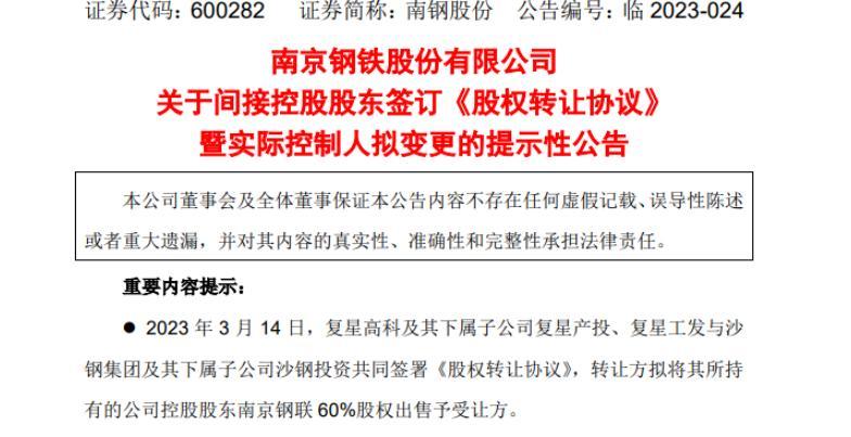 在去年10月份南鋼股份曾經發出過公告,復星系企業是有意向沙鋼集團去轉讓所持有的南鋼鋼聯的股權,這次的交易對價是不超過160億元的人民幣。如今這一次的超百億重股轉讓,終于迎來了落地的新鍵時刻。根據相關知情人的描述,復星工發與沙鋼集團和全資子公司共同簽署了關于南京南鋼鋼鐵有限公司的轉讓權協議,并且已經支付了意向金80億元。在此次的權益變動之前,復星系合計已經控制了南京鋼聯擁有的南鋼股份59.1%的股權。
