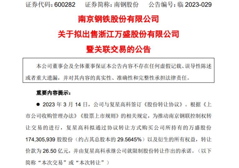 與這次交易同時推進的還有南京鋼聯控制權的轉讓交易,復星高科利用協議轉讓了南鋼股份持有的萬盛股份,此次交易達到了1.74億股份,包括衍生的一些權益轉讓價格達到了26.5億。據悉本次協議轉讓之后,萬盛股份的控股股東將由南鋼股份正式變成復星高科實際控股,幕后的實際控股人仍舊是郭廣昌。