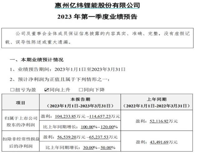 市值已經(jīng)超過1,300億元人民幣的電池廠億緯鋰能4月9日公布了公司首個季度的業(yè)績預,預計該公司在2023年第一季度將會實現(xiàn)的規(guī)模利潤值會達到10.42億元人民幣到11.47元人民幣,與同時期相比,會增長100~120%。2022年第四季度碳酸鋰的價格達到歷史上最高點時,億緯鋰能的規(guī)模凈利潤值僅有8.5億元人民幣。