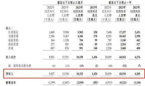 1.攜程2023年第四季度的凈營業收入達到人民幣103.25億,同比增長的幅度是105%。2023年全年的凈收入達到人民幣445.1億,與2022年的人民幣200.39億相比,同比增長的幅度達到122%。