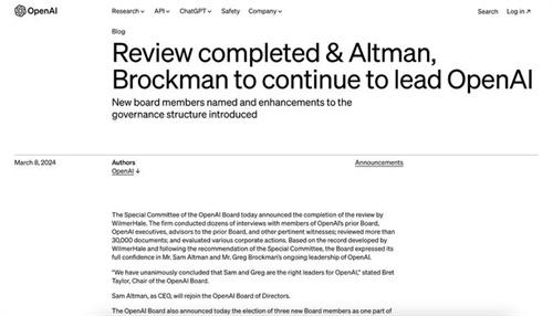 OpenAI官方在北京時間3月9日,連續發布兩篇公告,將CEO山姆奧爾特曼此前被罷免事件的調查結果公布,并宣布奧爾特曼重返董事會,董事會還同時新增加了三名新成員。