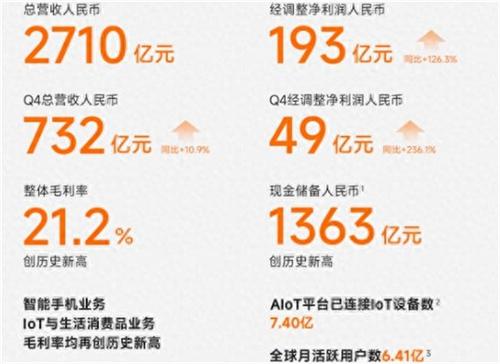 小米集團于3月19日發(fā)布了2023年全年及第四季度的業(yè)績報告,根據(jù)報告顯示,小米集團的毛利率和現(xiàn)金儲備再創(chuàng)新高,經(jīng)調(diào)整的凈利潤出現(xiàn)大幅度的上漲。小米集團2023年全年的營業(yè)收入達到人民幣2,710億,經(jīng)調(diào)整之后的凈利潤達到人民幣193億,同比增長的幅度達到126.3%。小米集團的毛利率達到21.2%,創(chuàng)下了近13年以來的新高,在智能電動車等創(chuàng)新業(yè)務方面的投入,達到人民幣67億。