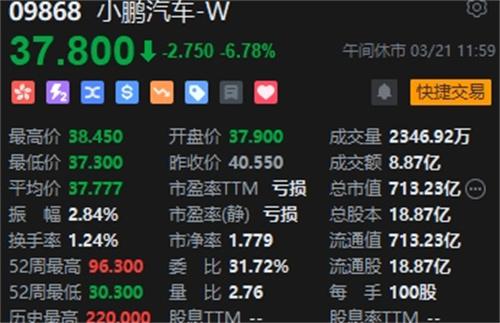 港股多數板塊在3月21日都出現了上漲,但是小鵬汽車不僅沒漲,還出現了下跌,盤中時的下跌幅度一度達接近了8%。截止到收盤時,小鵬汽車的股票價格為37.9港元,下跌幅度是6.5%。