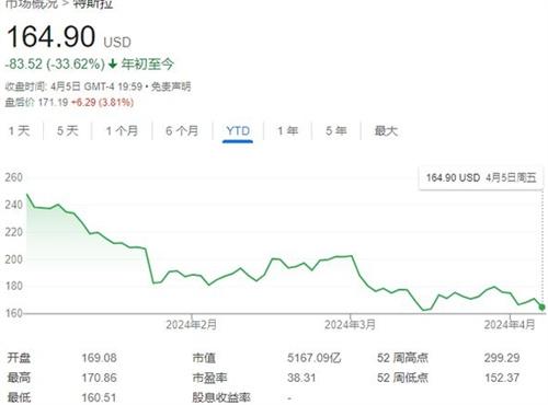 4.對于特斯拉來說2024年是充滿了坎坷的一年。自進入2024年以來 Ai熱潮不斷推動,其他大型科技股都不斷的上漲,但是特斯拉的股票價格卻不斷的下跌,到目前為止,下跌幅度已經接近34%。