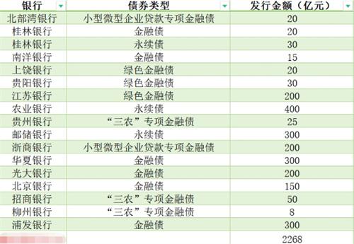5.兩家銀行發行了小型微型企業貸款專項金融債,總額達到人民幣220億,占比達到9.7%,其中浙江銀行發行的債券數額為人民幣200億,北部灣銀行發行了20億。