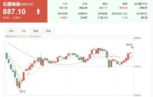 石墨電極板塊在五一假期歸來的首日盤中出現快速拉升,增長幅度一度超過了4.9%,接近了5%,盤中最高時沖到了894.83,將2024年1月份以來的新高刷新。其中東方碳素鋼盤中的上漲幅度超過15%,百川股份一度出現漲停,上泰科技、翔豐華、中銀絨業、中科電氣等多支股票跟漲。
