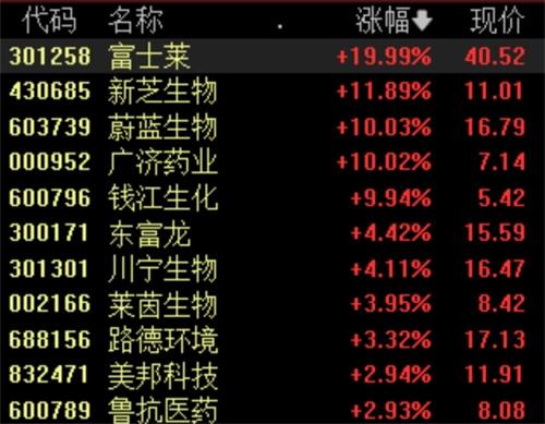 合成生物概念股,繼續(xù)保持活躍。截止今日上午10:30,蔚藍(lán)生物已經(jīng)實(shí)現(xiàn)5連板,富士萊已經(jīng)獲得三連板,廣濟(jì)藥業(yè)已經(jīng)獲得二連板,錢江生物的股票價(jià)格實(shí)現(xiàn)漲停,路德環(huán)境、川寧生物、萊茵生物等多支股票跟漲。