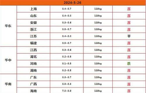 全國農產品批發市場,5月24日豬肉的平均價格是每公斤21.2元,與上周五的每公斤20.76元相比,上漲幅度達到2.1%。本周豬肉的平均價格是每公斤20.85元,與上周的每公斤20.5元的平均價格相比,上漲幅度達到1.7%。