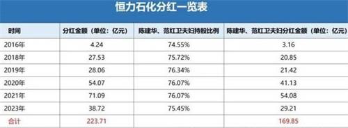 3.恒力石化登錄上交所至今已經(jīng)有8年的時(shí)間,其中有6年進(jìn)行了分紅,分紅的金額累計(jì)達(dá)到人民幣223.71億。按照范紅衛(wèi)、陳建華夫婦手中的持股比例進(jìn)行計(jì)算的話,這6年的時(shí)間里,二人共計(jì)獲得的現(xiàn)金分紅達(dá)到人民幣169.85億。