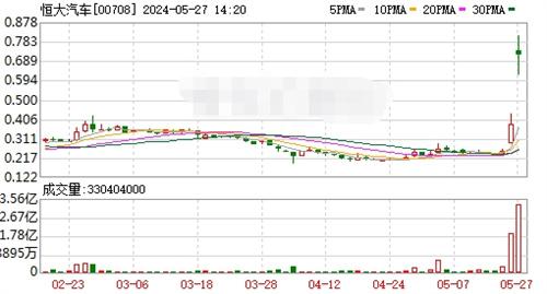5月27日,中國恒大新能源汽車集團有限公司向港交所遞交復牌的申請,并且披露一項潛在的股份出售計劃。港股恒大汽車高開94.74%,該公司31.45億股潛在代售股票將被即時收購。
