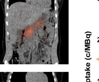 來自荷蘭拉德布德大學(Radboud University)研究團隊采用了單光子發射計算機斷層掃描(SPECT)這種非侵入性核成像技術,來檢測胰腺對示蹤劑111In-exendin的吸收,這種示蹤劑可以靶向在β細胞上大量表達的GLP-1受體,從而檢測胰腺中仍然存留的β細胞。在非糖尿病人群體內,GLP-1受體與腸道分泌的多肽類激素GLP-1相結合,可以刺激胰島素的分泌,并且抑制胰高血糖素的分泌,從而促進血糖的新陳代謝。