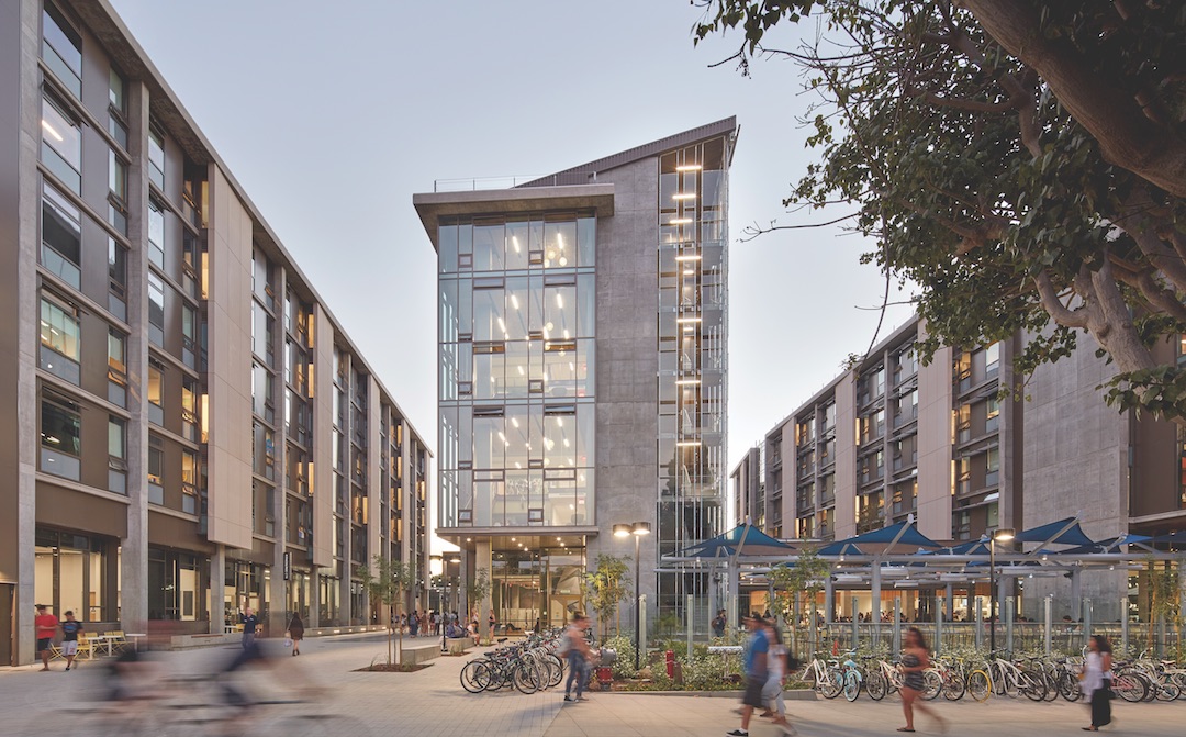 幸運的是,UCI能夠立即回應(yīng)納波利塔諾的指令,其中包括一個正在籌備中的項目:它的第一座高層住宅,Mesa Court Towers,三座六層結(jié)構(gòu),共計250,972平方英尺。這座價值9670萬美元的綜合建筑于2016年秋季完工,為269間客房的一千多名一年級學(xué)生提供床位。這里有一個19,975平方英尺,950個座位的餐飲公共區(qū)(“The Anteatery”,在UCI的吉祥物,食蟻獸之后),可容納2,500名學(xué)生,2,906平方英尺的健身中心,非常受歡迎的咖啡館,音樂和臺球室,瑜伽中心,九個公共廚房,大房間和洗衣房。這一切都在2.75英畝。你好,密度高!