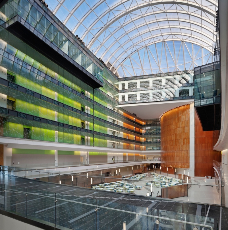 中庭屋頂長(zhǎng)500英尺,長(zhǎng)45,000平方尺,由AESS拱形鋼管構(gòu)件組成,支撐充氣乙烯四氟乙烯(ETFE)織物屋頂。雖然看起來很清楚,但定制的絲網(wǎng)印刷圖案和充滿空氣的ETFE系統(tǒng)可以在減少太陽(yáng)能增益的同時(shí)提供顯著的日光。極輕量化可最大限度地減少與ATFP相關(guān)的影響,并有助于減少管結(jié)構(gòu)尺寸和噸位。