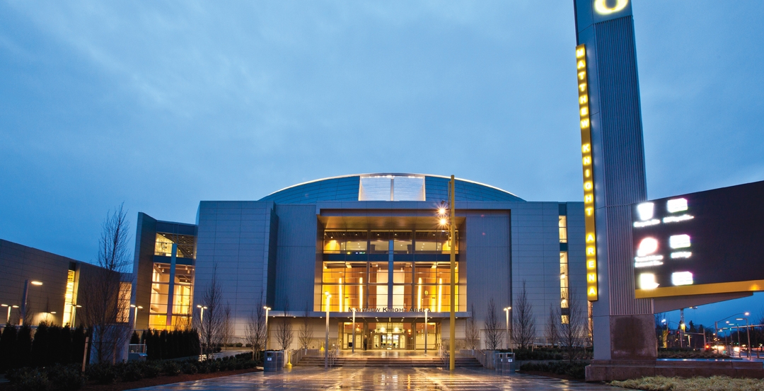 俄勒岡大學的馬修騎士競技場于1月13日開始對陣南加州大學的男子籃球比賽。耗資2.27億美元的競技場取代了學校84歲的麥克阿瑟法院,由密蘇里州堪薩斯城的Ellerbe Becket與俄勒岡州波特蘭的TVA建筑師事務所合作設計,JMI Sports(項目經理),亨德森工程師(MEP),Haris Engineering(結構工程師)和Hoffman Construction(CM)。三層樓,405,000平方英尺的設施有一個36度傾斜的座位碗,以復制它所取代的較小競技場的近乎動作的感覺,雖然這個新的容納12,364個風扇。該設施還有兩個俱樂部區域,活動級休息室,培訓,重量和更衣室。該項目的目標是LEED黃金。順便說一句,Ducks以68-62擊敗了特洛伊木馬。