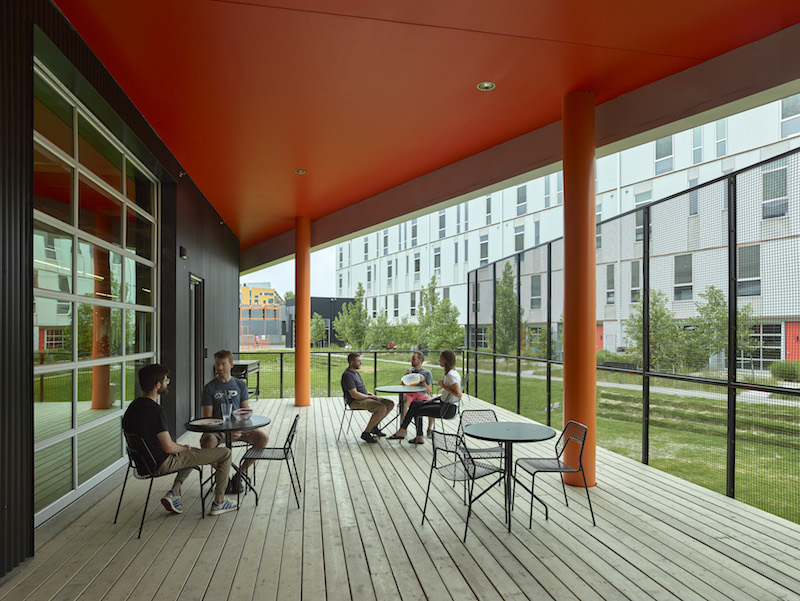 上層設(shè)有36間投機式辦公套房,配有Opendesk家具系統(tǒng),共用會議室和電話亭。辦公室俯瞰并打開了由建筑物的13,000-sf綠色屋頂環(huán)繞的露臺,這是科羅拉多州最大的綠色屋頂之一。綠色屋頂空間通向連綿起伏的丘陵,樹林和1700千瓦的太陽能光伏陣列,抵消了該建筑用電量的20%左右。該建筑包括一個兩層中庭,戶外會議空間,一個100自行車存儲設(shè)施,以及一個與大堂相連的1,100平方英尺的藝術(shù)工作室。