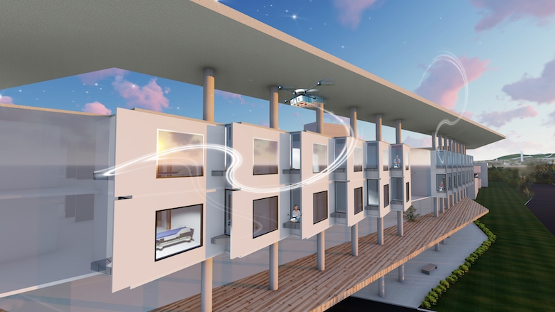 無人機被視為支持醫院恢復能力的可能工具。Leo A Daly的邁阿密工作室為無人駕駛飛機醫院開發了一個概念,該醫院將使用無人駕駛飛行器(UAV)直接向患者提供食品和醫療用品。