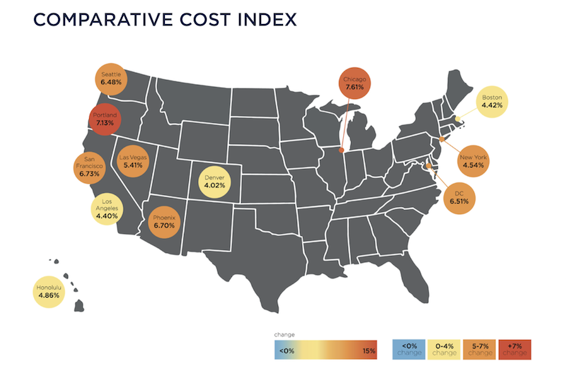 Rider Levett Bucknall的最新季度成本報告顯示了建筑成本因市場而異。圖片:RLB2018年全國建筑成本平均上漲5.73%,芝加哥和俄勒岡州波特蘭市的主要城市增幅最大。當許多市場處于建筑活動周期或接近建筑活動周期時,成本上升,而且行業失業率仍然高于整個國家。這是在最新的北美季度建筑成本報告中的兩個發現,由房地產和建筑顧問Rider Levett Bucknall(RLB)發布,并基于對14個地鐵中的15種建筑類型的分析。(分析的部門包括單戶和多戶住房,以及停車結構。)可在此處訪問完整的季度報告。