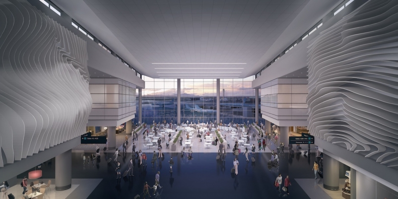 新航站樓將擁有170萬(wàn)平方英尺的空間,每年可容納2300萬(wàn)人。渲染由HOK提供由HOK設(shè)計(jì)的重建項(xiàng)目包括一個(gè)三層,170萬(wàn)平方英尺的碼頭和廣場(chǎng),每年將為2300萬(wàn)乘客提供服務(wù)。一個(gè)名為峽谷的內(nèi)部空間將位于航站樓的中心。它將舉行安全檢查區(qū),購(gòu)物和餐飲設(shè)施。藝術(shù)家戈登·赫瑟(Gordon Huether)的大型波浪雕塑將在墻上排成一排。