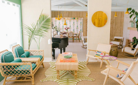 主要有兩個(gè)起居區(qū):一個(gè)毗鄰設(shè)有藤制椅子的前臺,另一個(gè)位于粉紅色壁爐旁。