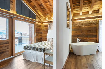 內(nèi)部:高高的天花板,打結(jié)的木壁板和裸露的橫梁為房屋增添了小屋般的質(zhì)感,客廳設(shè)有質(zhì)樸的石壁爐?,F(xiàn)代化的廚房位于起居室和餐廳區(qū),并設(shè)有一個島/酒吧。在主臥室,有個浸泡浴缸,非常適合在山上度過漫長的一天后放松身心。