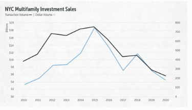 根據Ariel Property Advisors的年終研究,紐約市的多戶家庭市場在過去十年中創下了最低的美元交易量,該市的232筆交易(包括424座建筑物)的總收入為45.1億美元。與2019年相比,美元,交易量和建筑量分別下降了36%,21%和12%。
