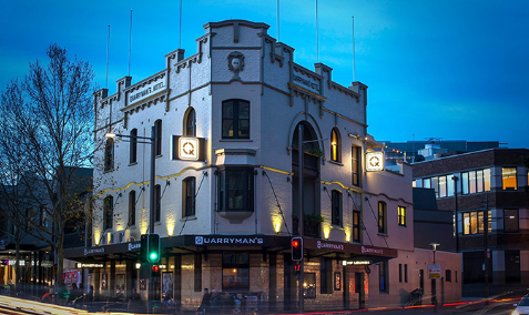 The Quarryman's Hotel 位于 Pyrmont Bridge Road 和 Harris Street 的拐角處,是一家三層酒店,包括一個享有 CBD 和天際線景觀的屋頂啤酒花園。