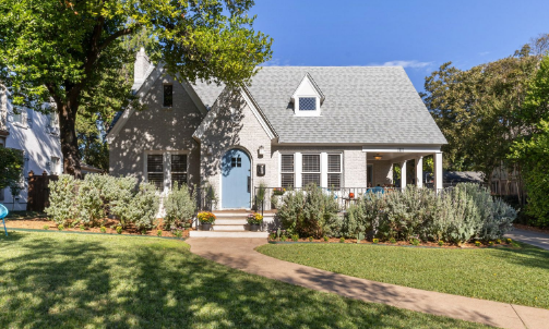 從 1111 S. Canterbury Court 的路邊可以看到住宅的都鐸式設計元素。淡藍色的圓形前門、斜屋頂和環(huán)繞式門廊為今天帶來了舊世界的感覺。