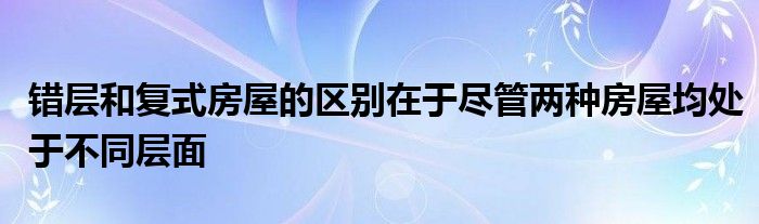 錯層和復式房屋的區別在于盡管兩種房屋均處于不同層面,但復式層高往往超過一人高度,相當于兩層樓,而錯層式高度低于一人,人站立在第一層面平視可看到第二層面。因此錯層有“壓縮了的復式”之稱。另外,復式的一、二層樓面往往垂直投影,上下面積大小一致;而錯層式兩個(或三個)樓面并非垂直相疊,而是互相以不等高形式錯開。