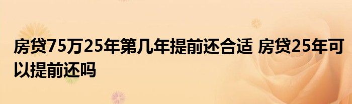 大家好,我是云百科的客服小柏,我來為大家解答以上問題。房貸75萬25年第幾年提前還合適,房貸25年可以提前還嗎,很多人還不知道,現在讓我們一起來看看吧!