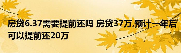 大家好,我是云百科的客服小柏,我來為大家解答以上問題。房貸6.37需要提前還嗎,房貸37萬,預計一年后可以提前還20萬,很多人還不知道,現在讓我們一起來看看吧!